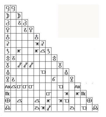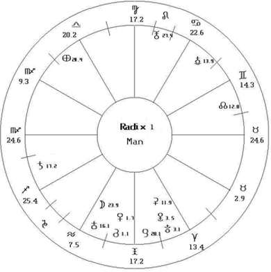 Hieronder volgen de radix en de aspectentabel van voorbeeldhoroscoop 1.